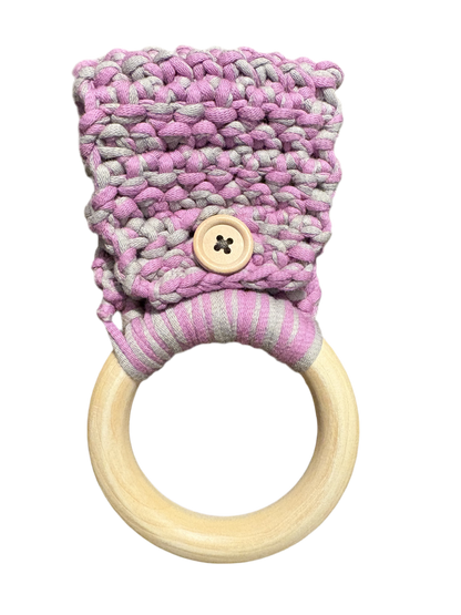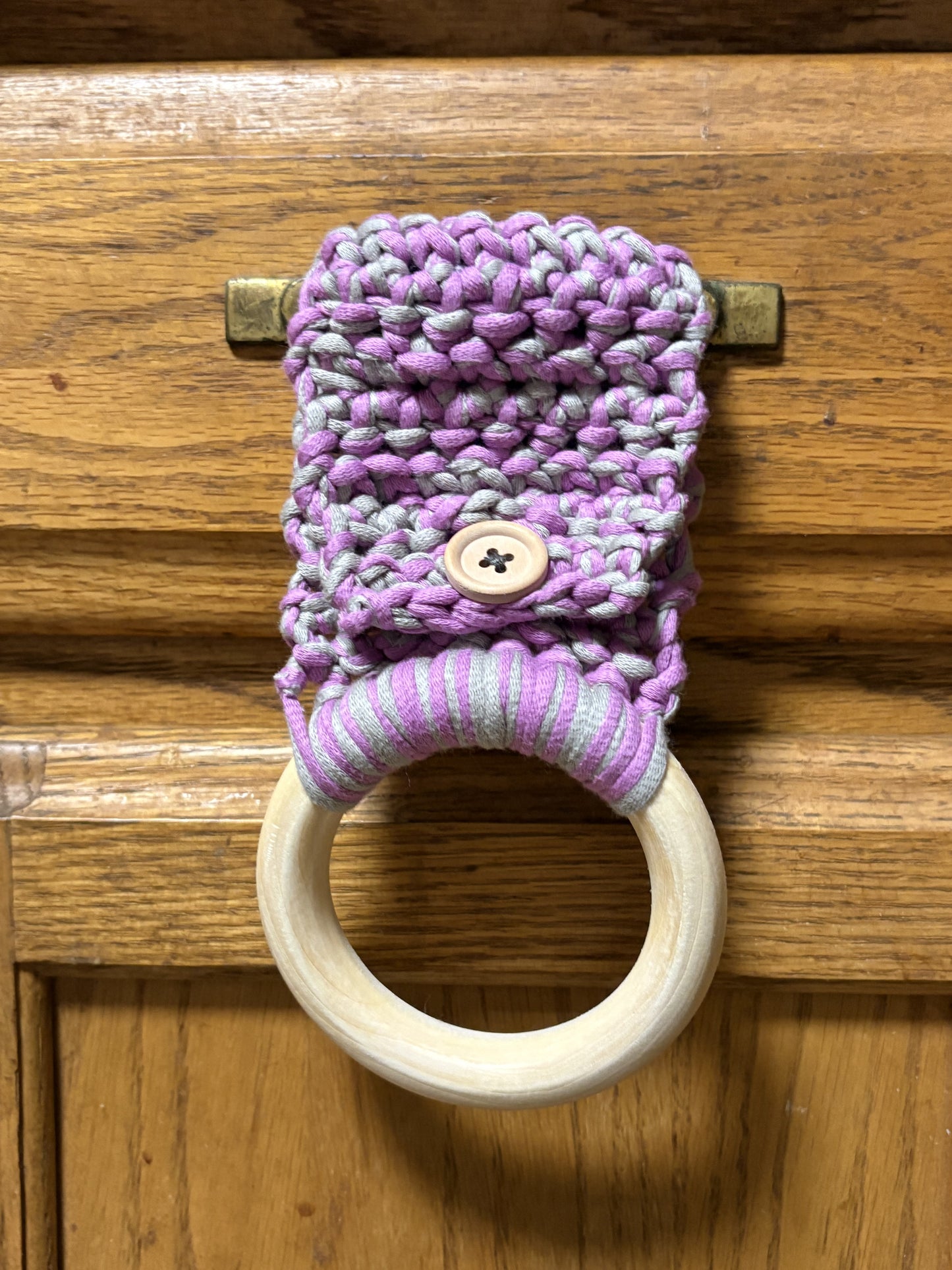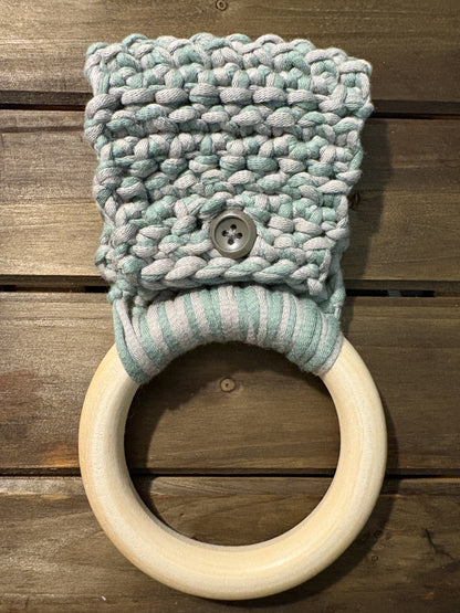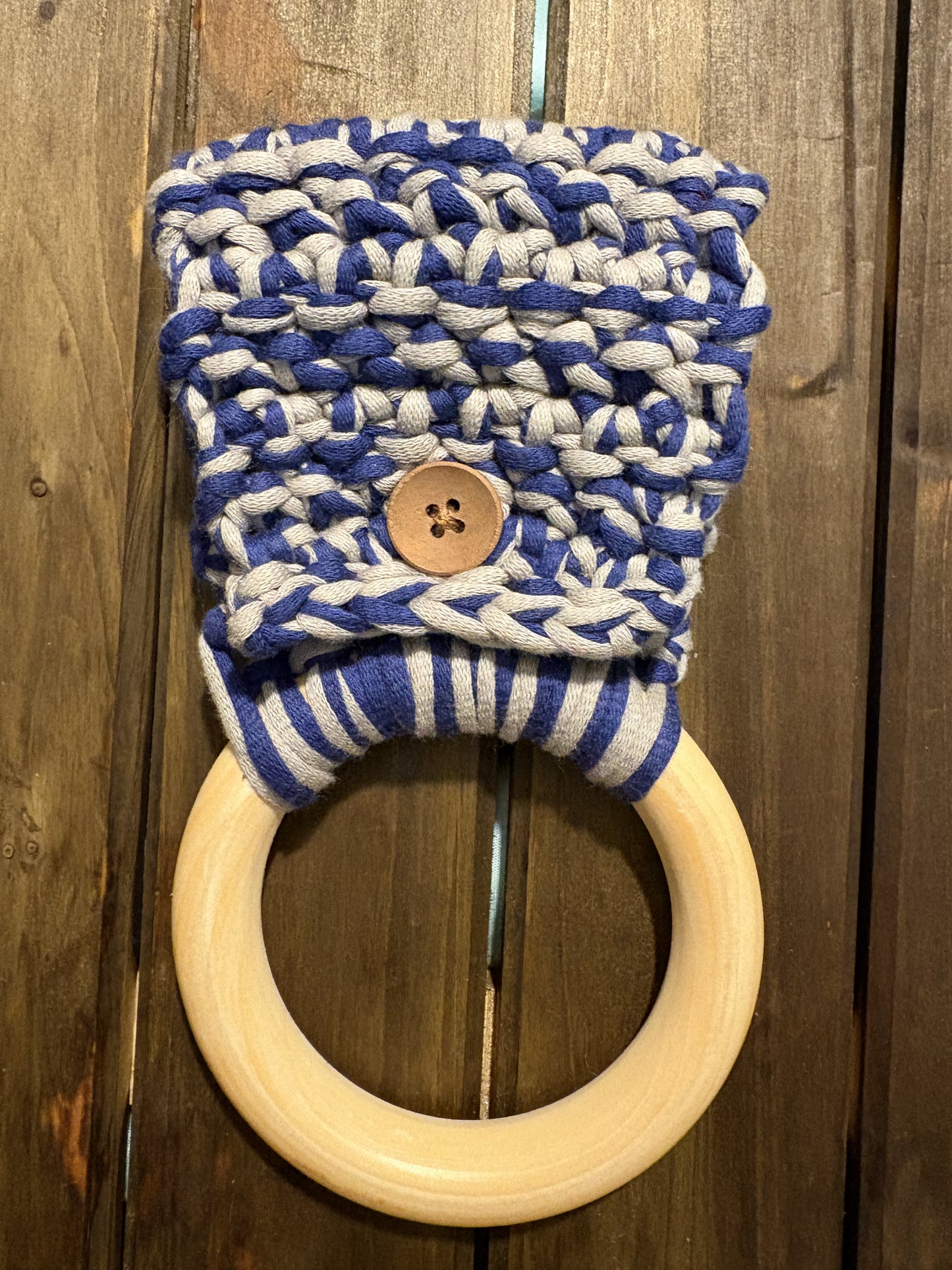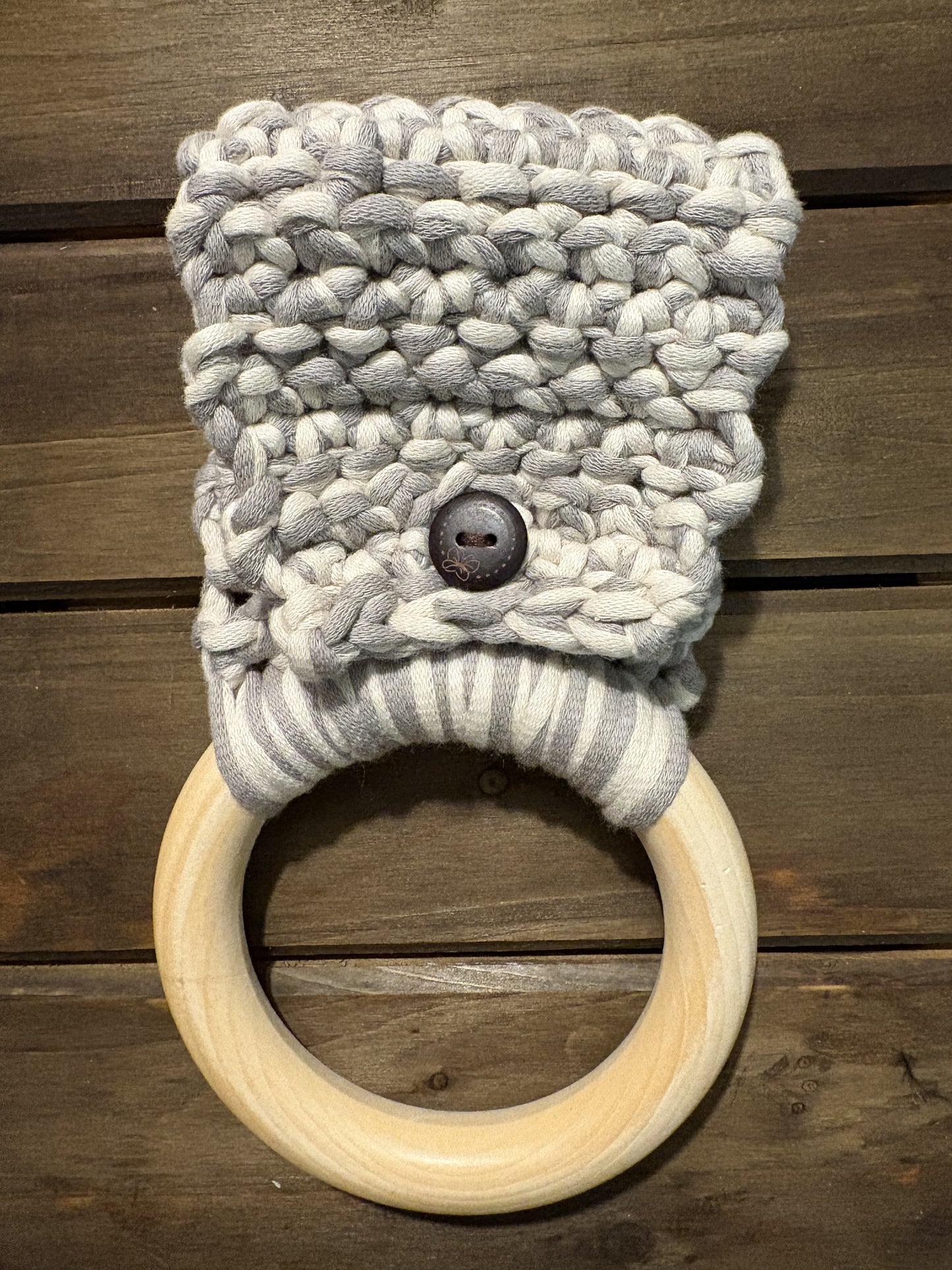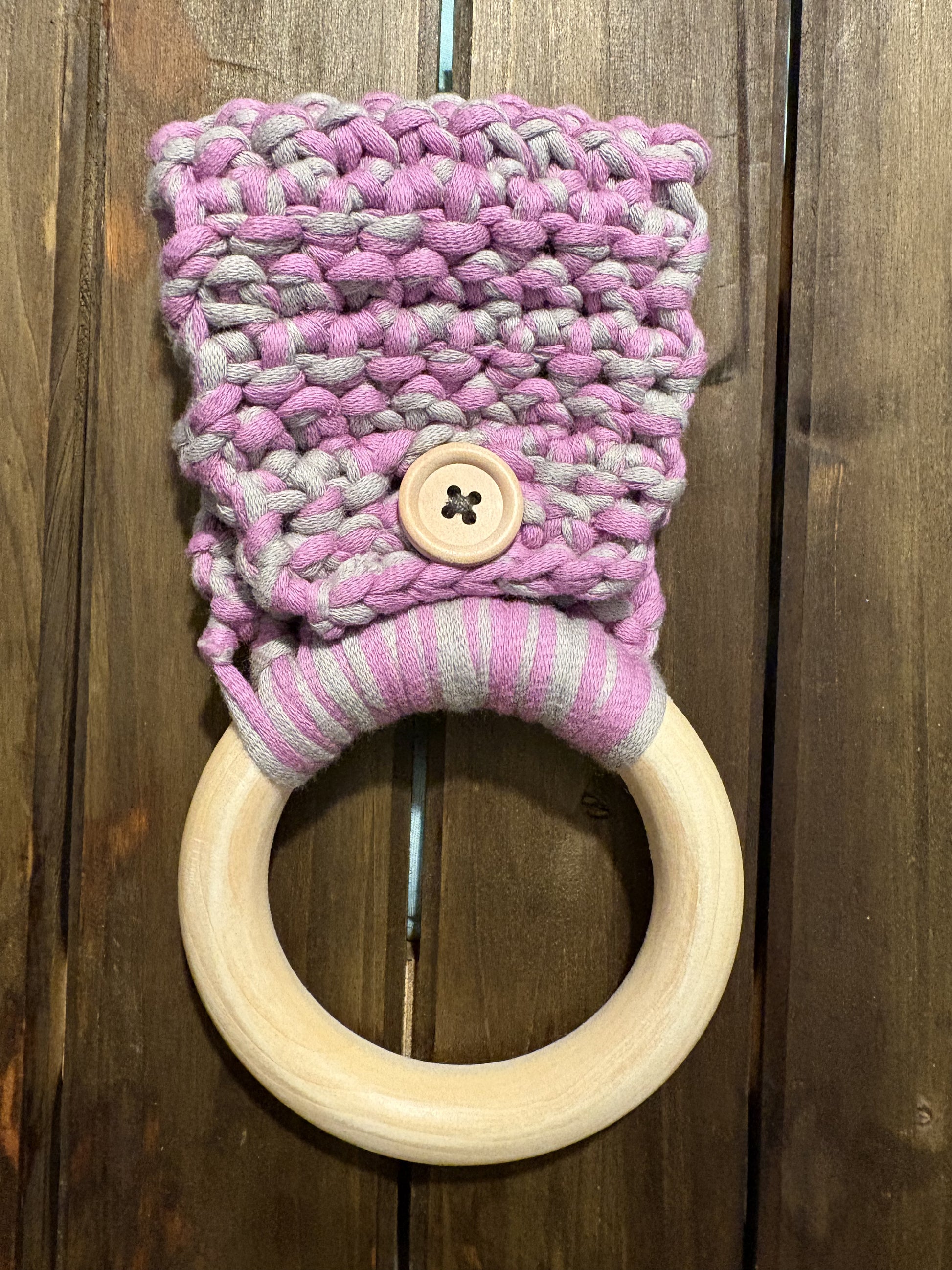 Materials: wooden ring and button, Cotton and nylon blend yarn. Colors may appear different in person.