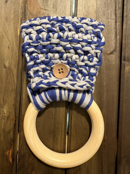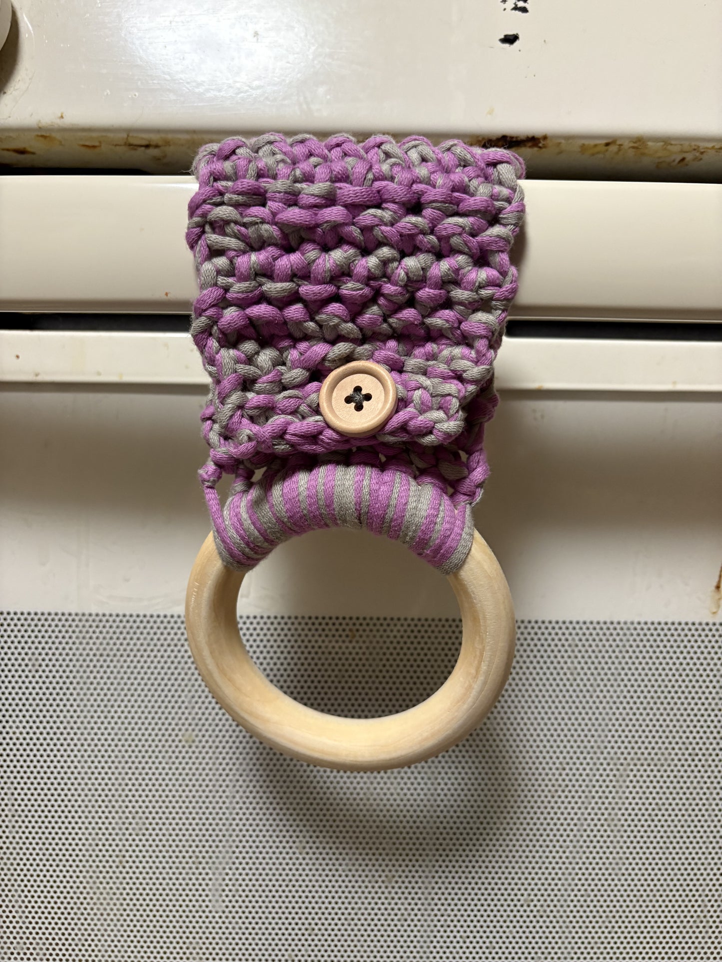 These crochet kitchen towel holders are a must for your kitchen! With a convenient wood button, this should fit any handle bar or oven bar. With a 4” wooden ring, your hand towel can be safe and secure while also easy to access.