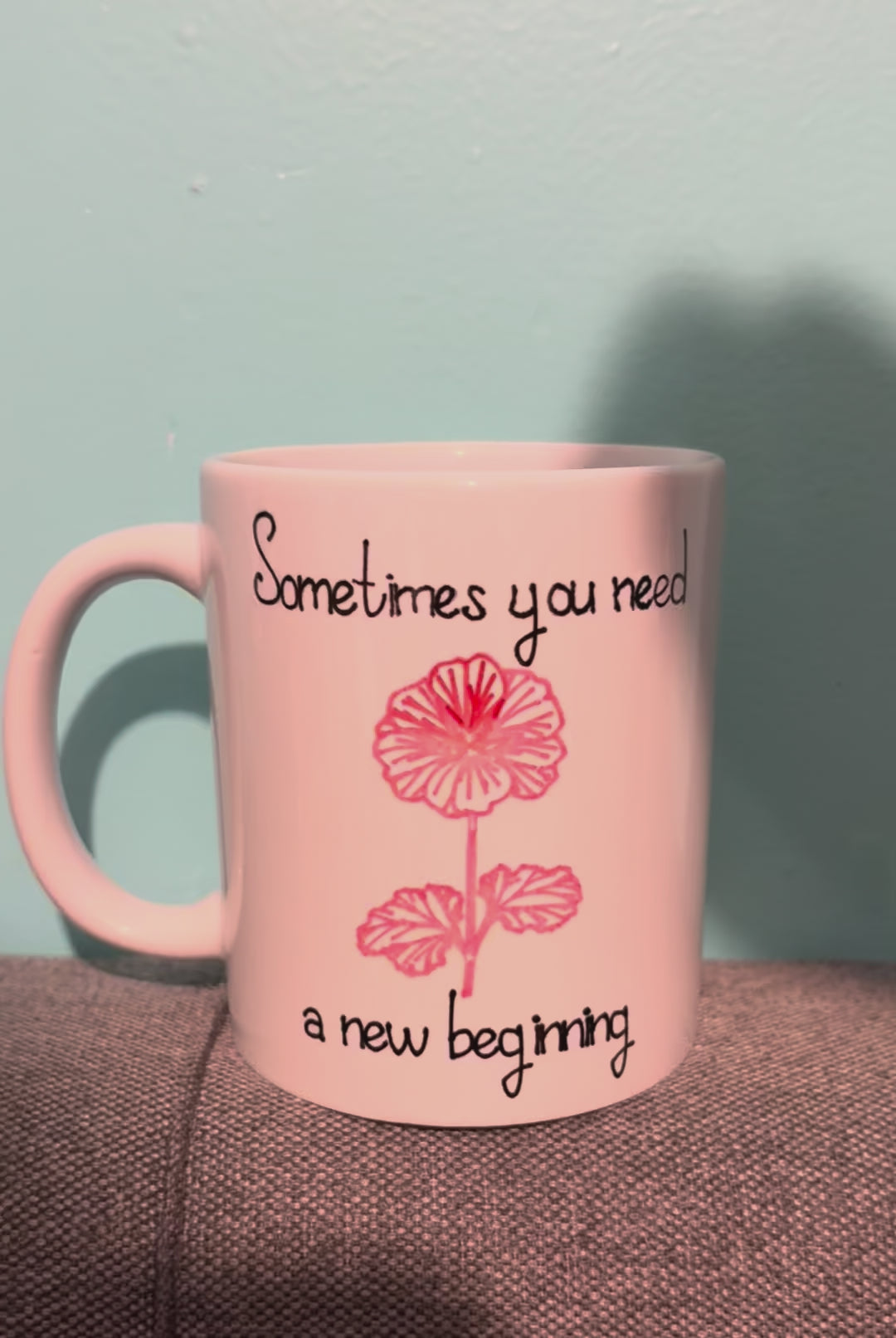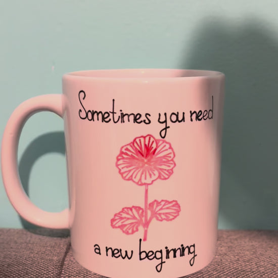 This 12oz mug features a single geranium in the shade party pink, and a geranium bouquet in Wild aster, with a saying of ‘sometimes you need a new beginning to bloom and grow into yourself’.